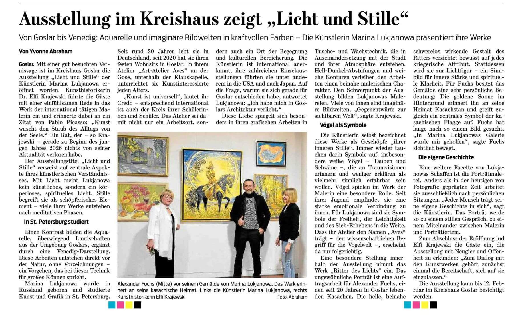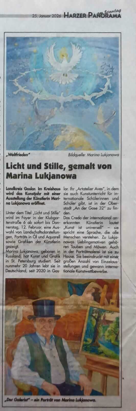 Die Künstlerin Marina Lukjanowa zeigt Aquarelle und symbolistische Malerei voller Licht, Farbe und innerer Ruhe. Zentrale Motive sind Licht als geistige Kraft, Stille als schöpferischer Raum und weiße Vögel als Symbole von Freiheit und Seele.